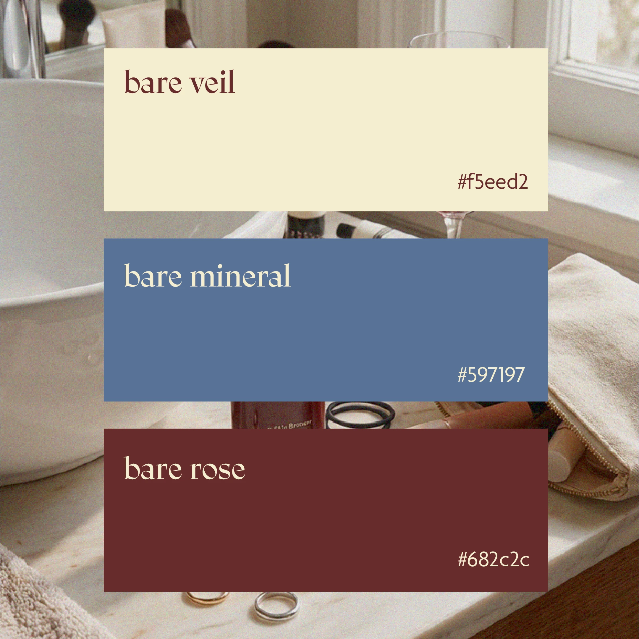 The core colour palette (bare veil, bare mineral and bare rose ) was built from skin-adjacent tones that feel considered without being literal. The typography prioritises calm hierarchy over personality performance. The photography direction prioritises real skin, close proximity and everyday context over editorial distance or clinical precision.